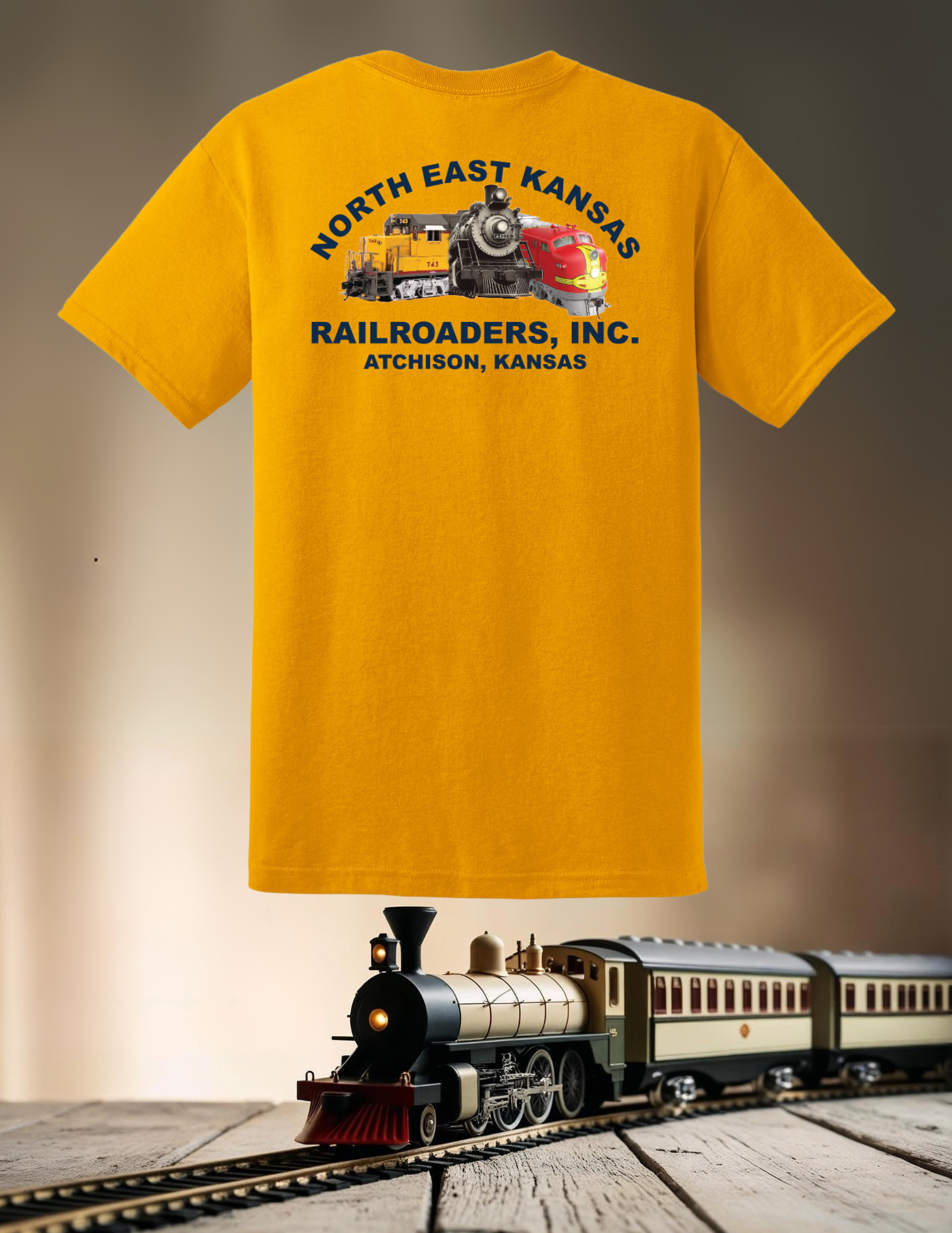 Wear your passion for railroads with this premium gold tee from North East Kansas Railroaders. Crafted from soft, comfortable fabric, it's the perfect choice for train enthusiasts who want to show their support for the hobby community. Whether you're at the layout or out and about, this shirt lets fellow railroaders know where your heart is. Comfortable enough for all-day wear, it's a must-have for anyone dedicated to preserving railroad heritage and connecting with like-minded hobbyists.